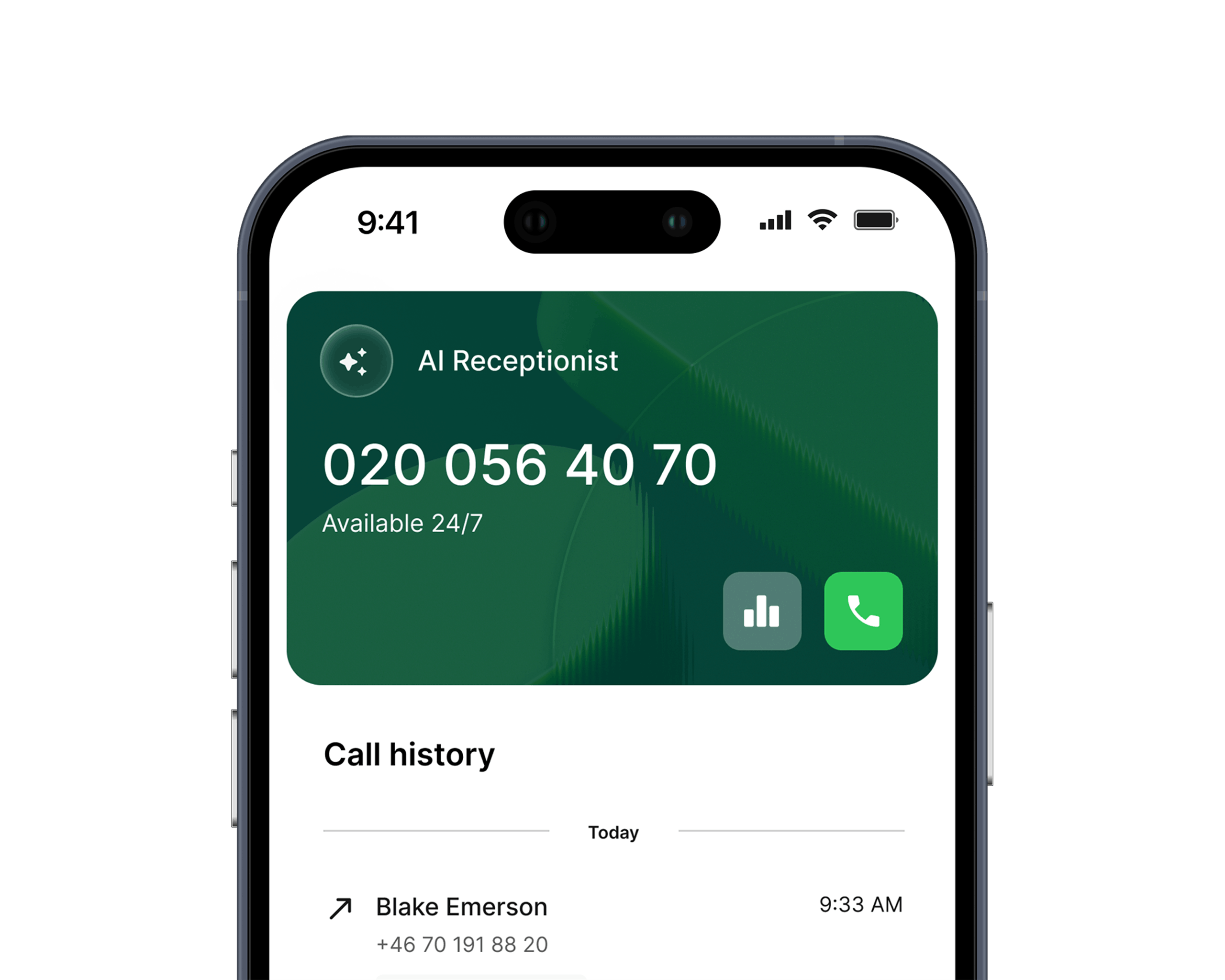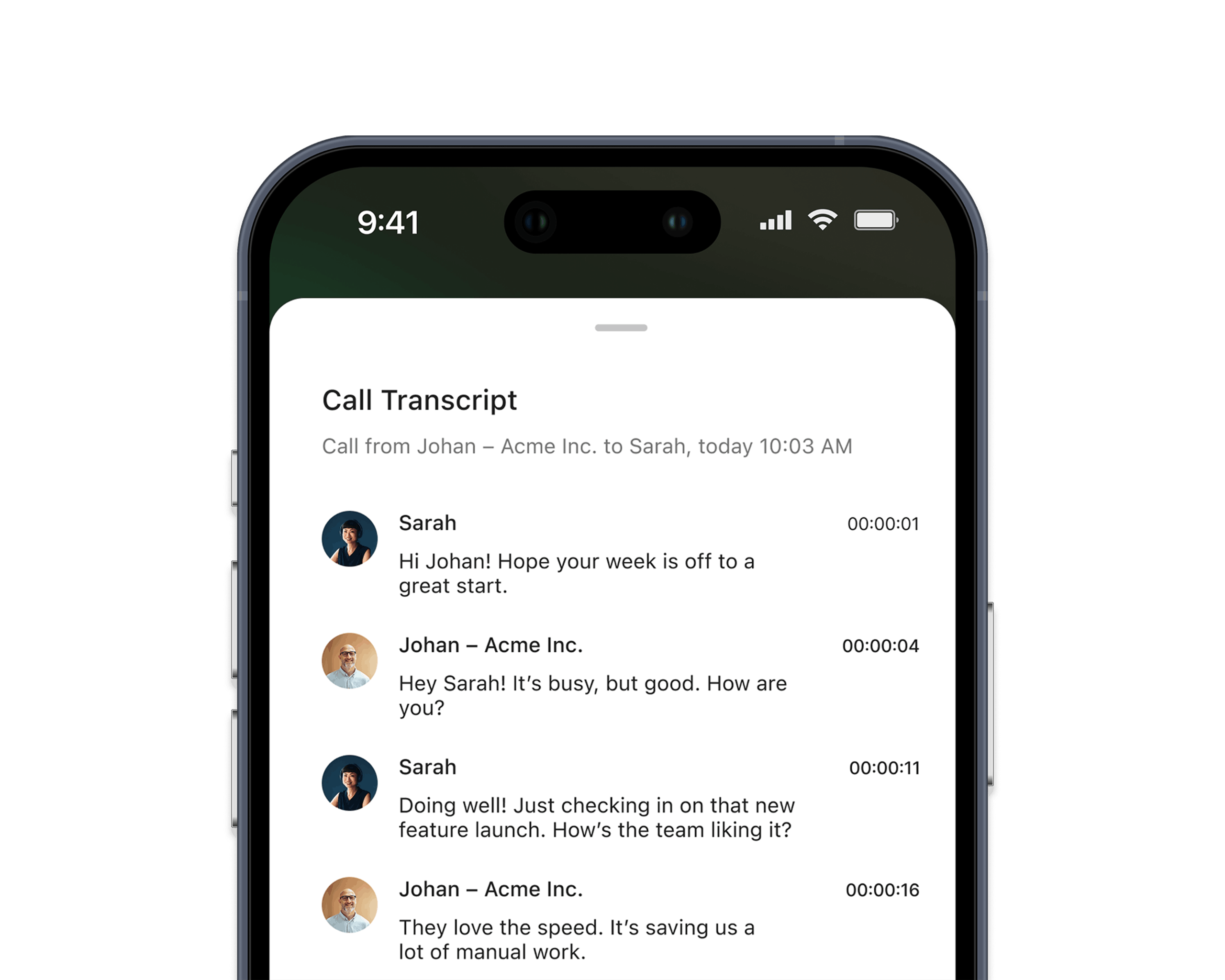 Transkriberar, analyserar och sammanfattar alla dina samtal direkt i Telavox app. Hjälper dig att snabbt hitta viktig information, beslut och nästa steg utan att behöva lyssna igenom hela samtalet.